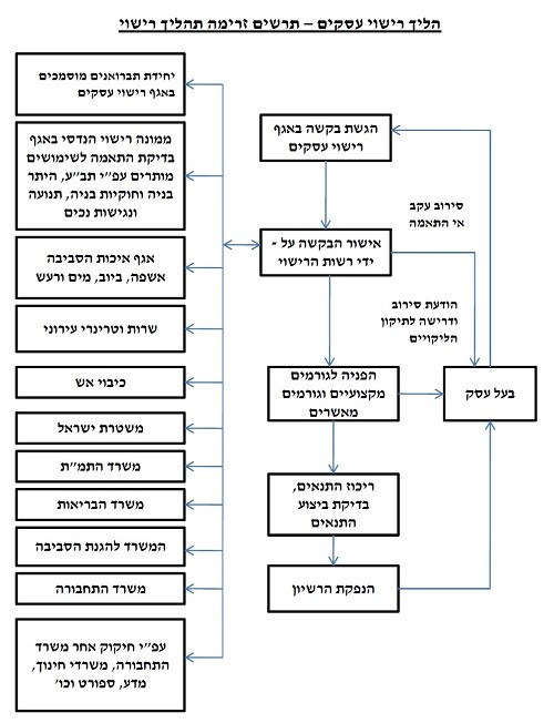 بعد الموافقة على الخطة الهندسية لملائمة المصلحة التجاريّة مع قانون التخطيط والبناء، سيتم تحويل الطلب إلى جهات الموافقة ذات الصلة (إدارة الإطفال, الشرطة , وزارة الصحة, وزارة حماية البيئة, زارة الزراعة والصناعة) وغيرها من الجهات حسب نوع المصلحة التجاريّة, من أجل أخذ موافقتهم وشروطهم أو اعتراضهم المبرّر بالأسباب على فتح المصلحة التجارية.